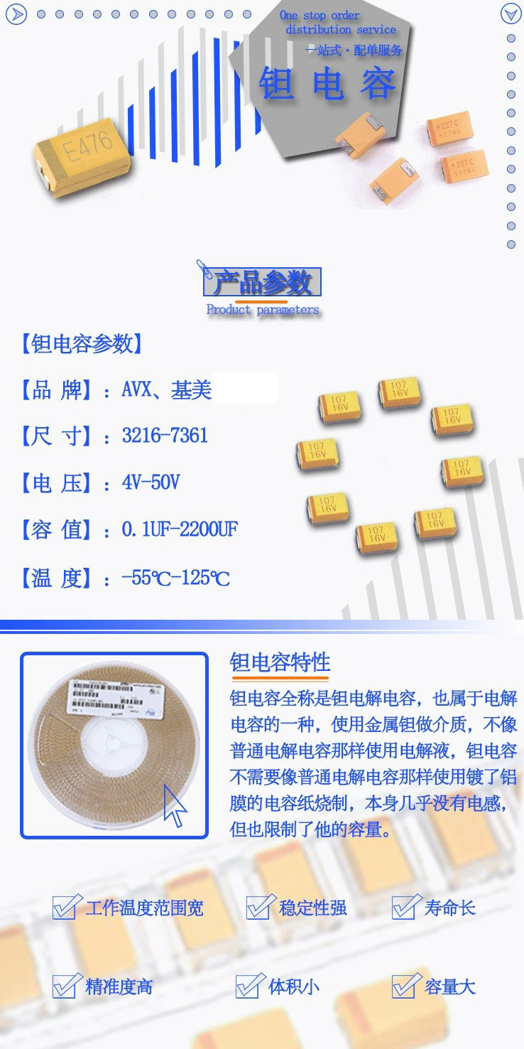 鉭電容是電容器中體積小而又能達(dá)到較大電容量的產(chǎn)品,是1956年由美國(guó)貝爾實(shí)驗(yàn)室首先研制成功的,它的性能優(yōu)異。鉭電容器外形多種多樣,并制成適于表面貼裝的小型和片型元件。